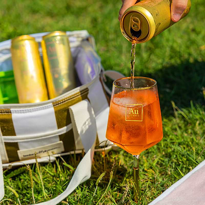 Discover the ultimate blend of sophistication and outdoor practicality with our new Au Picnic Glass. Designed specifically for outdoor use, the Picnic Pointer allows you to enjoy your Au Vodka anywhere, without spills. Simply slide the glass upper lass stem inside the gold point and it remains upright, stable, and effortlessly refined.