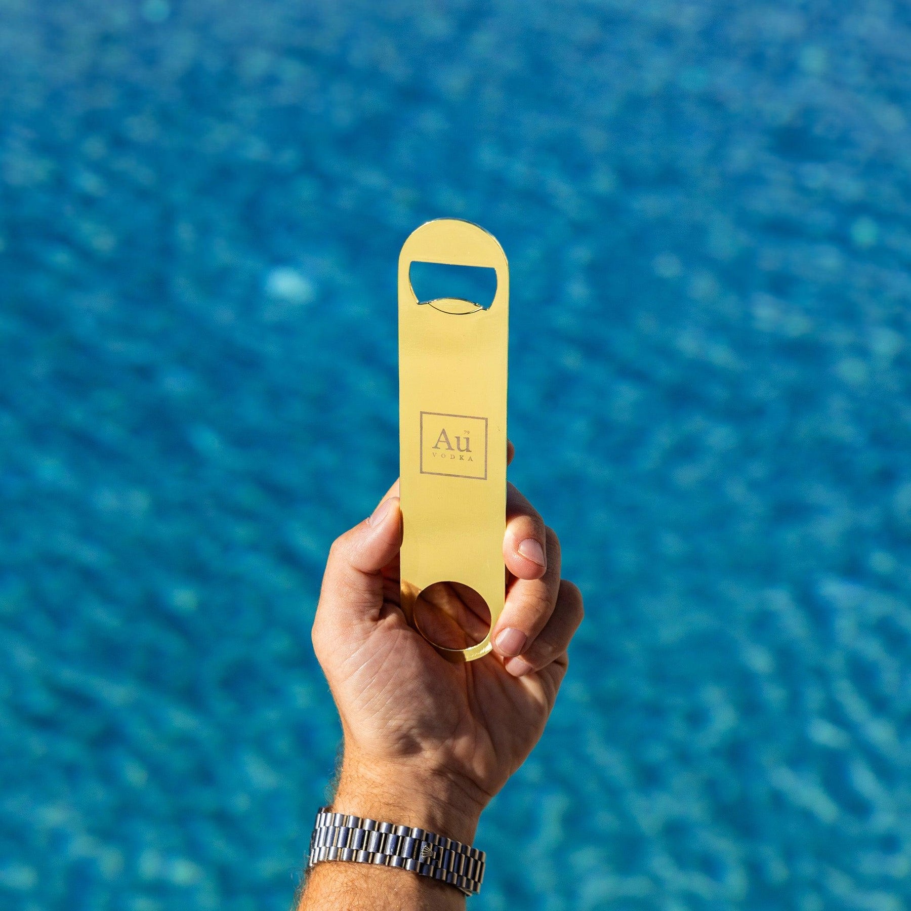 Au Vodka branded gold bar blade, finished in stainless steel, perfect for any home bar!