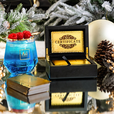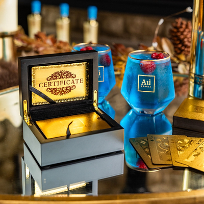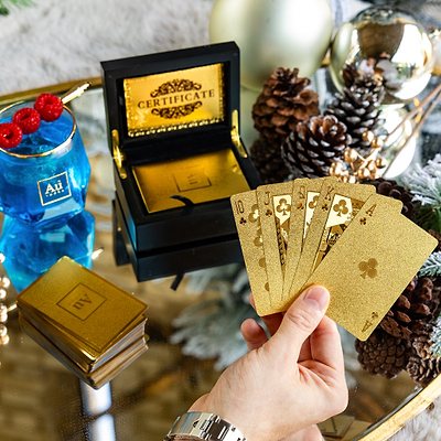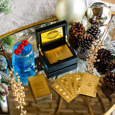 Our Au golden playing cards come in an acrylic box with a velvet interior and gold detailing with our signature Au logo. Inside the Acrylic box the cards come in a gold branded box with 52 playing cards.